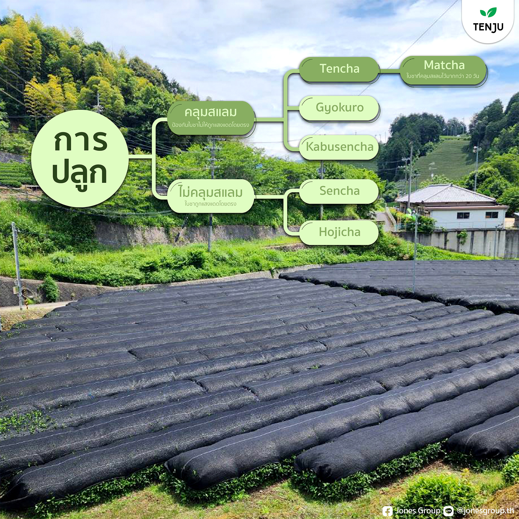 ปลูกโดยการคุมสแลม เพื่อไม่ให้ใบชากระทบแสงแดดโดยตรง เพราะแสงส่งผลให้ L-Theanine เปลี่ยน Catechin อาจทำให้เกิดรสชาติขมและฝาด ชา TENJU Matcha ถูกคลุมด้วยสแลมยาวนานถึง 20 วัน ช่วยให้ L-Theanine ยังคงอยู่และทำให้เกิดรสชาติหวานกลมกล่อมละมุนลิ้นของชามัทฉะ และผงมัทฉะจะมีสีเขียวเข้ม