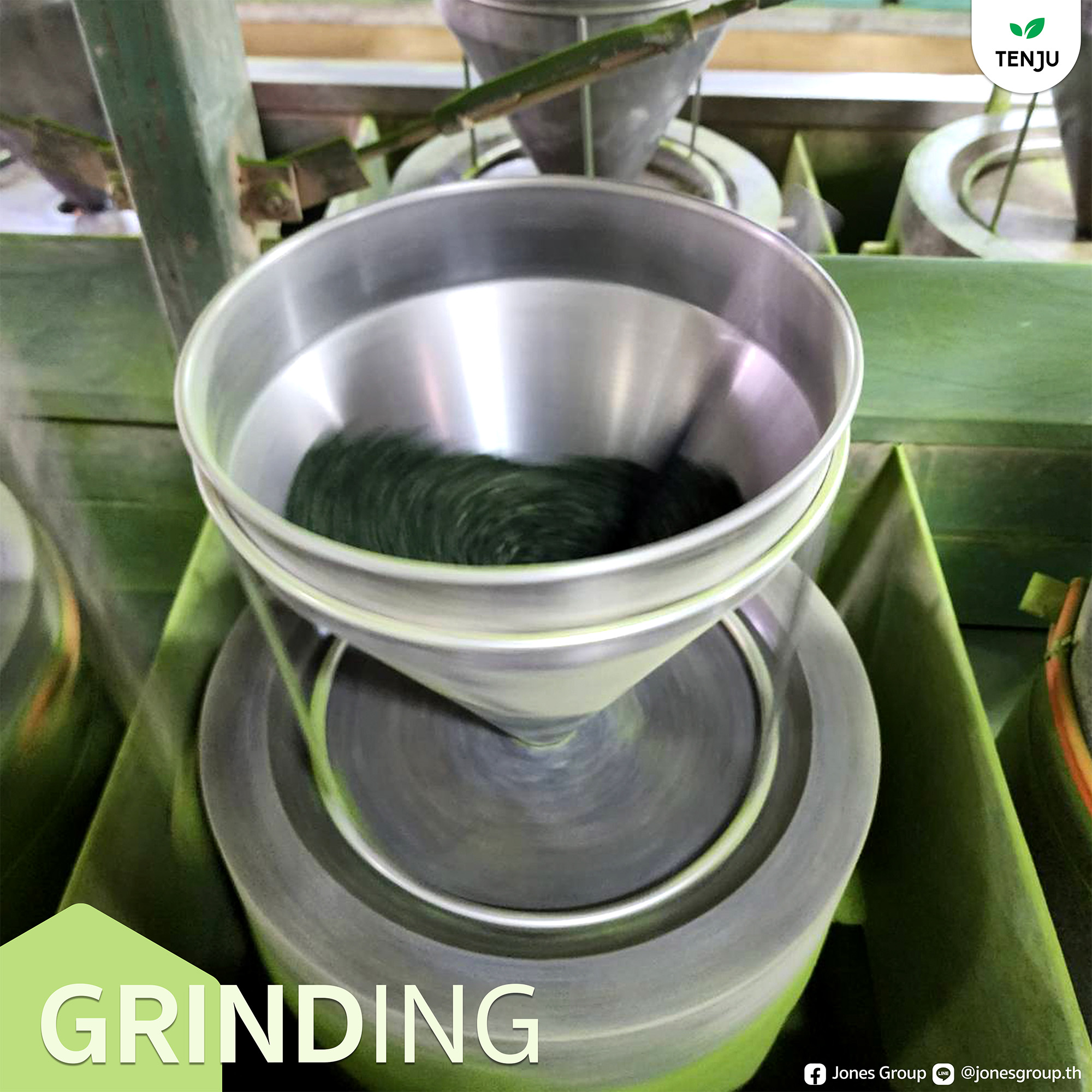 นำใบชาที่เก็บเกี่ยวมา Sterilize เพื่อฆ่าเชื้อ และ บด (Stone Grinding) ก่อนที่จะทำการบรรจุลงในซอง การบดด้วยเครื่องโม่หิน (Stone Grinding) เป็นการบดมัทฉะตามแบบฉบับญี่ปุ่นแท้ๆ โดยการจะให้ผลผลิต ผงมัทฉะเพียง 30 กรัม/ชั่วโมง เท่านั้น ผง TENJU Matcha จึงมีความละเอียดมากเป็นพิเศษ ทำให้ละลายน้ำได้ง่าย